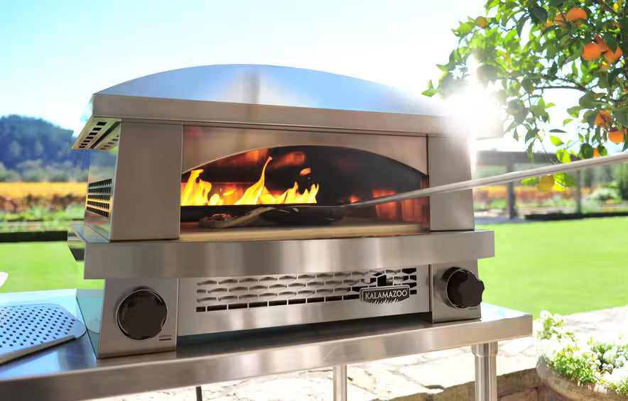 When it comes to cooking authentic Neapolitan-style pizzas, heat intensity is a crucial factor. Professional pizzaiolas traditionally use ovens heated to at least 800 degrees. High cooking heat makes for perfect pillowy, crispy crusts. The Kalamazoo Artisan Fire Pizza Oven has two burners; one beneath the cooking deck, and one above it, allowing you to separately control cooking intensity for the crust and toppings. The Kalamazoo outdoor pizza oven can reach 1000 degrees and cook a thin-crust pizza in less than three minutes.