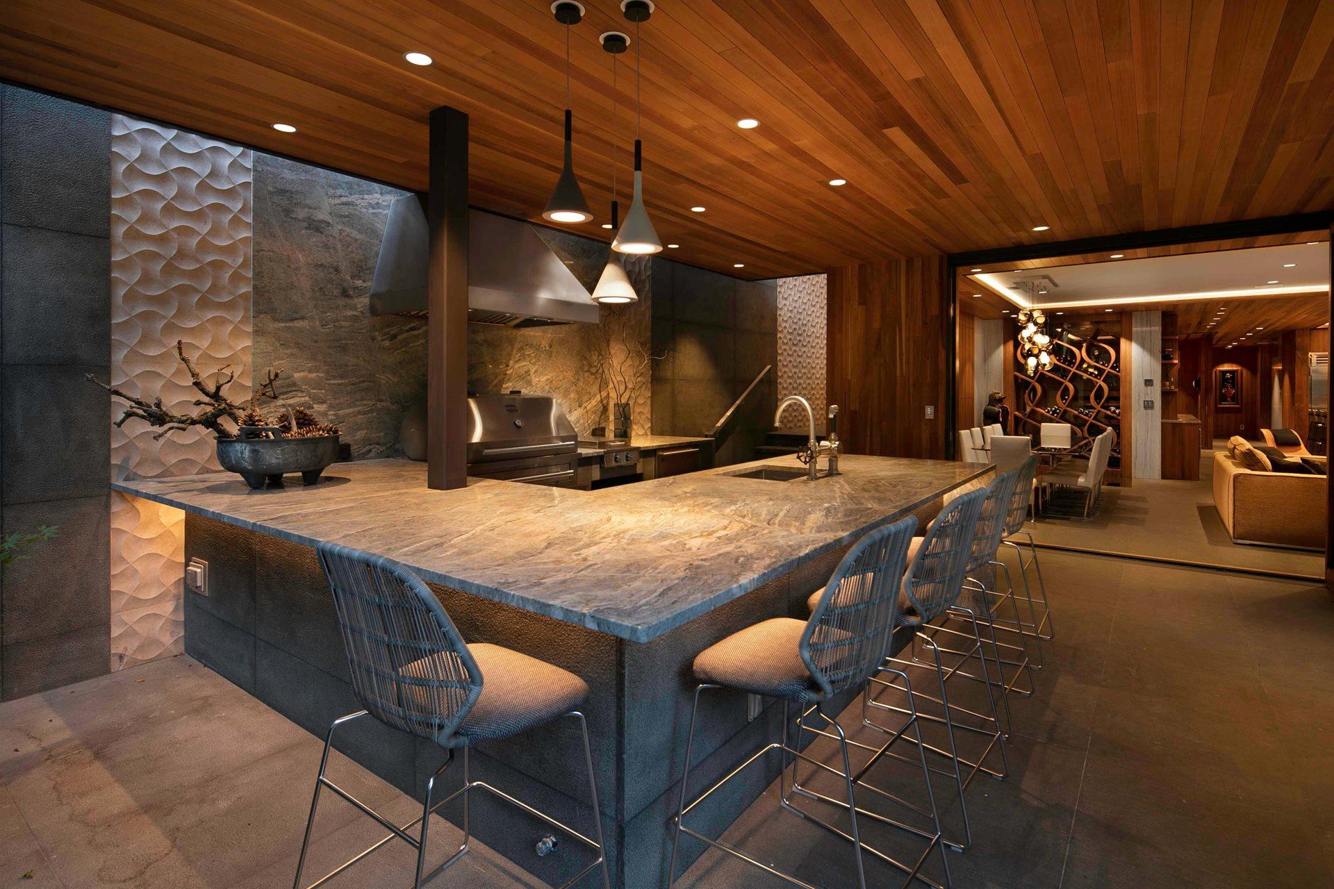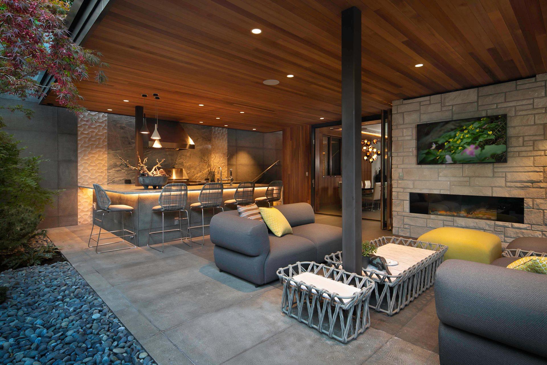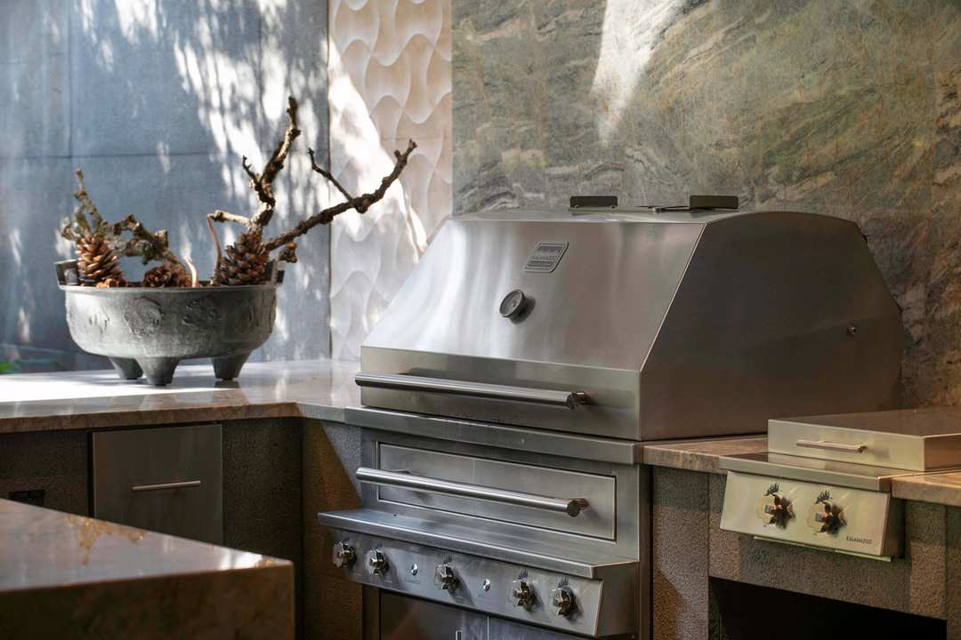 According to the new owners, a great deal of focus was placed on the outside of the home. A large doorway fully opens to the outdoors, revealing a private open-air entertaining area with natural elements from the surrounding environment. Beautiful wood finishes found inside the home flow seamlessly into the covered outdoor space, which provides year-round usability. Anchored by a fully-functional outdoor kitchen, the refined materials and warm accents perfectly complement the timeless design of the K750HB Hybrid Fire Grill and stainless steel Signature Series cabinetry and appliances.