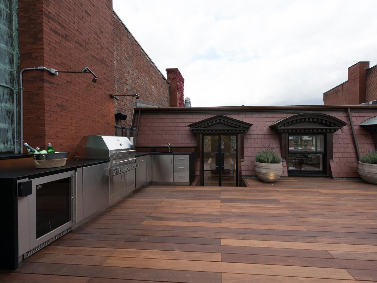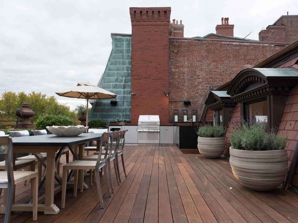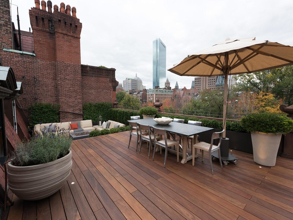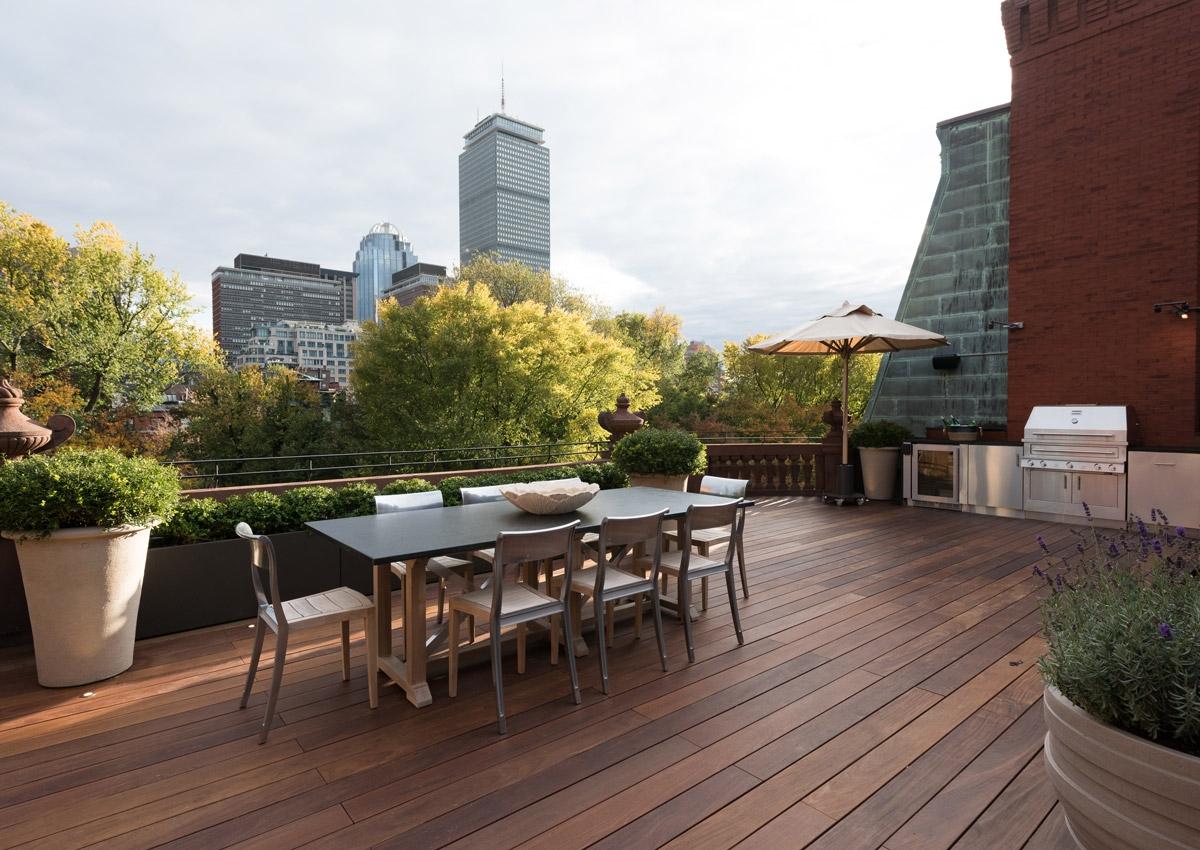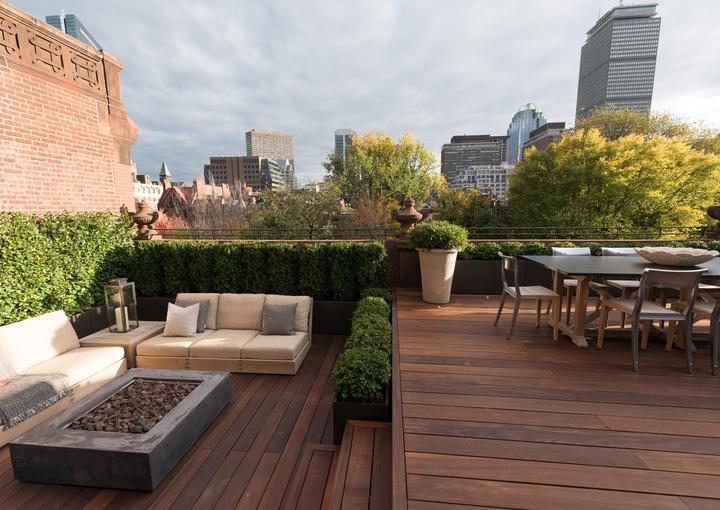 By Jacalyn GouldThis rooftop outdoor space takes its design cues from the character and color of the buildings’ brick facade. Warm ipe-wood floors, red slate shingles, plenty of greenery and cozy, neutral furnishings create an inviting atmosphere to take in the expansive views of downtown Boston.