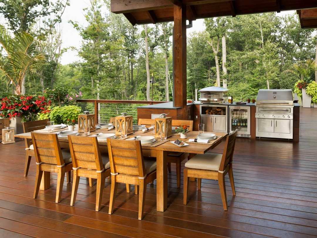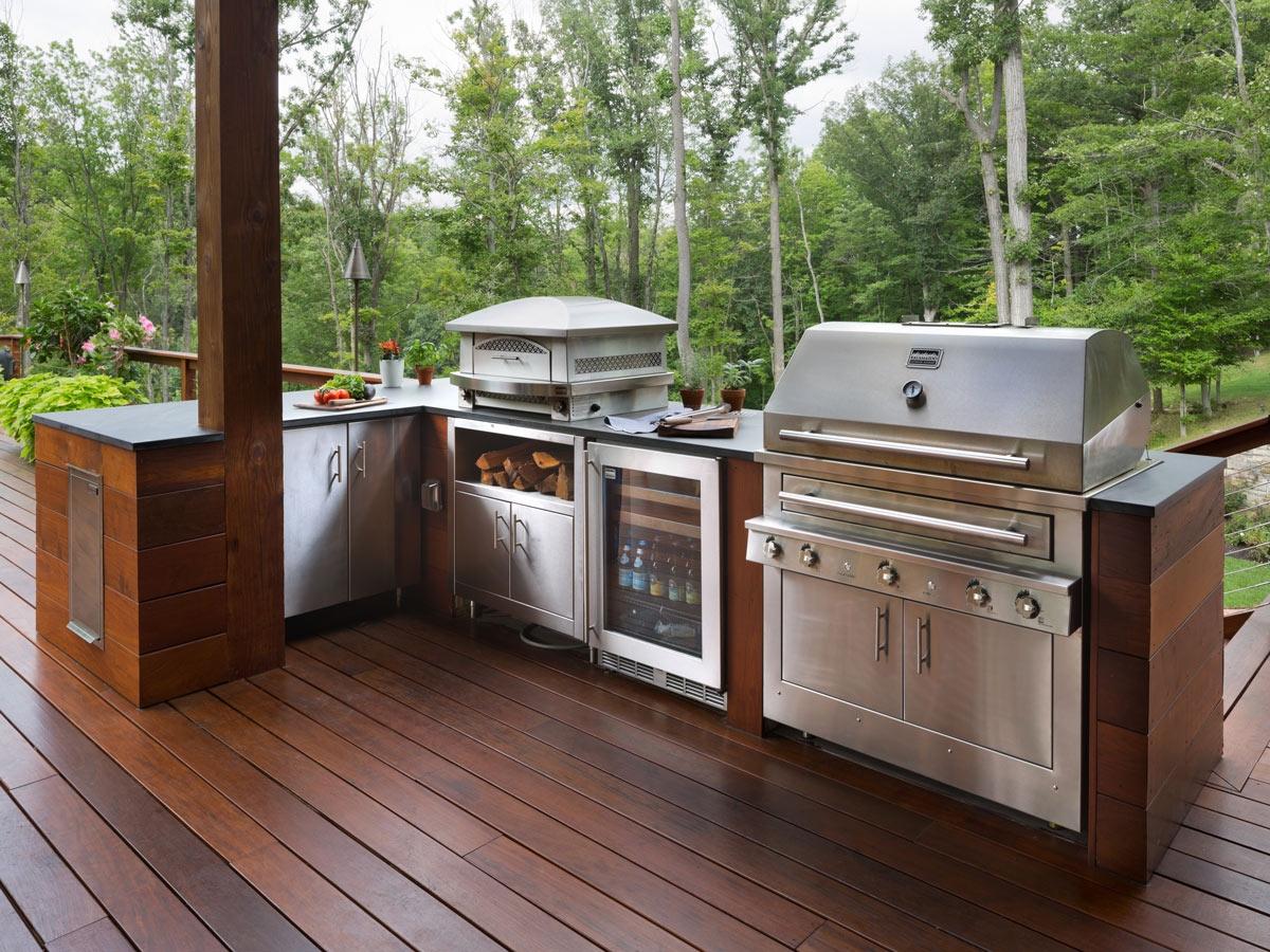 A glass-front refrigerator and convenient cabinetry add valuable storage space that looks sleek and seamless alongside the cooking equipment. Nearby, a stash of wood is kept at the ready for wood-fired meals on the grill. With a comfortable, covered dining area that seats eight, this “weeknight kitchen” has become a beloved hangout space for casual family meals.