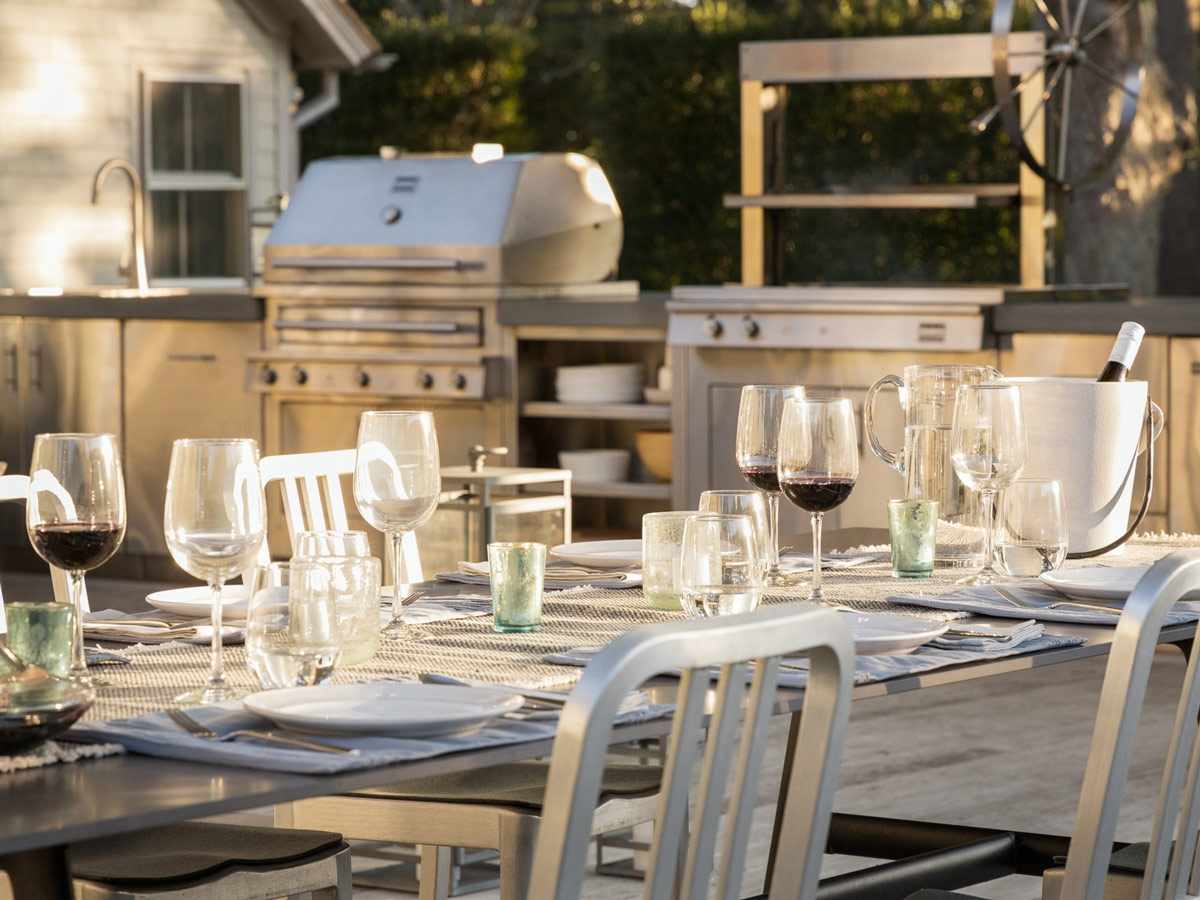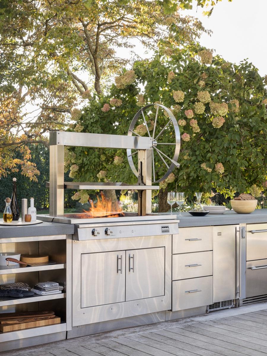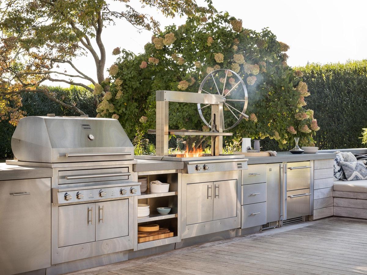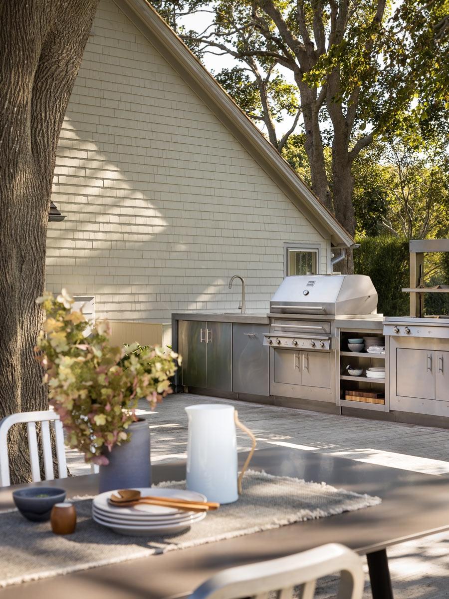 This generous outdoor living space in the Hamptons has a cool and calming grey color palette that perfectly complements the outdoor kitchen’s sophisticated stainless steel appliances and cabinetry. With a large surrounding backyard and tall hedges, the space’s fire pit and expansive deck are exceptionally private.