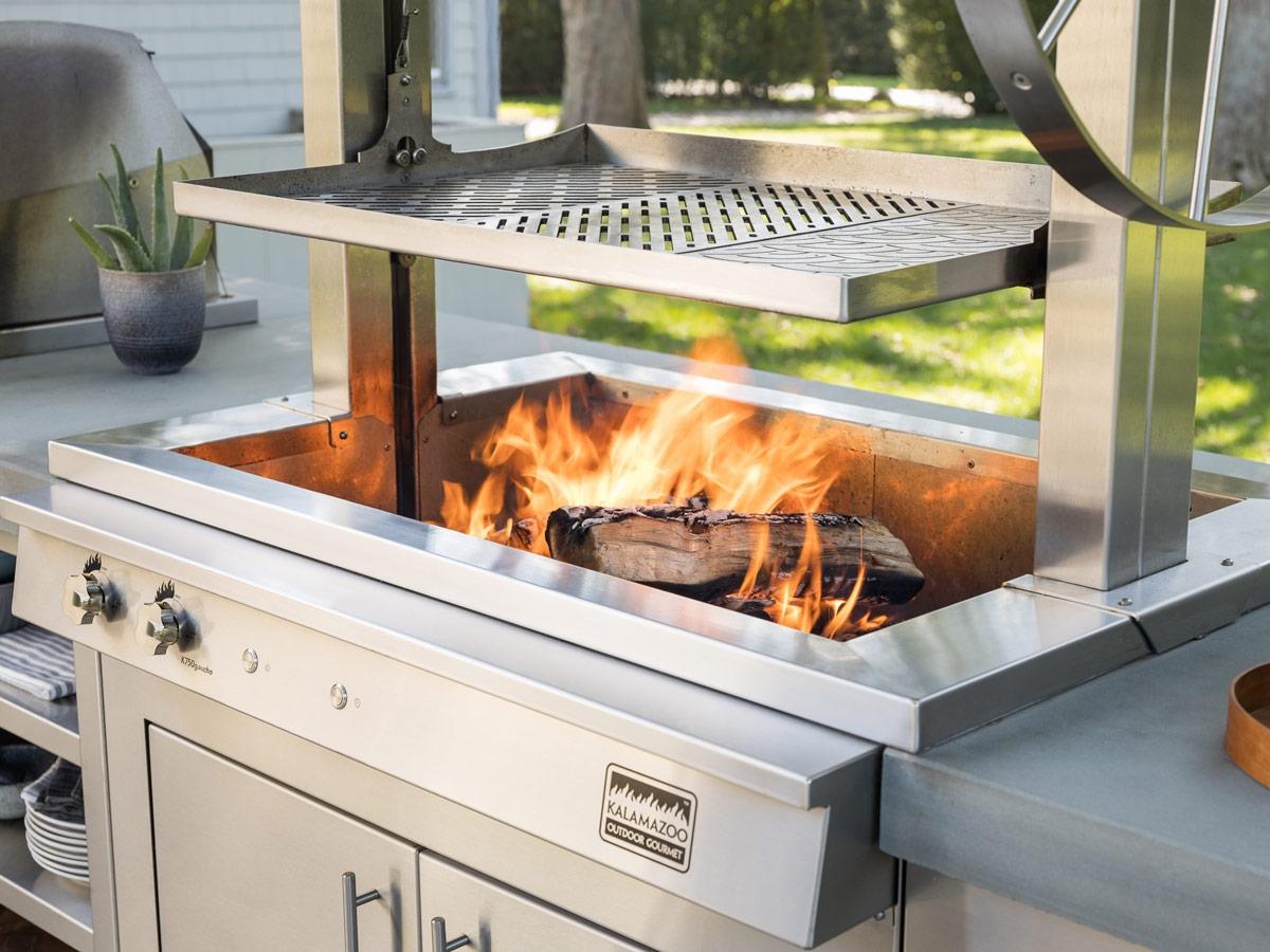 A K750HB Hybrid Fire Grill and K750GB Gaucho Grill in the outdoor kitchen offer the homeowners endless cooking possibilities. With the Hybrid Fire Grill, everything from high-heat, gas-only searing to low and slow, wood-smoke infused American barbecue is possible. The Gaucho Grill is a visually stunning centerpiece with an eye-catching 30-inch spoked wheel that raises and lowers the grilling surface above the wood fire for total temperature control. The Gaucho’s gas starter ensures a more convenient primal cooking experience. Weather-tight Signature Series storage creates a sleek, timeless look across the whole kitchen while protecting dishes and linens from the elements. Refrigerated drawers, a sink and trash and recycling cabinets allow this outdoor kitchen to be used completely independently of the indoor kitchen.