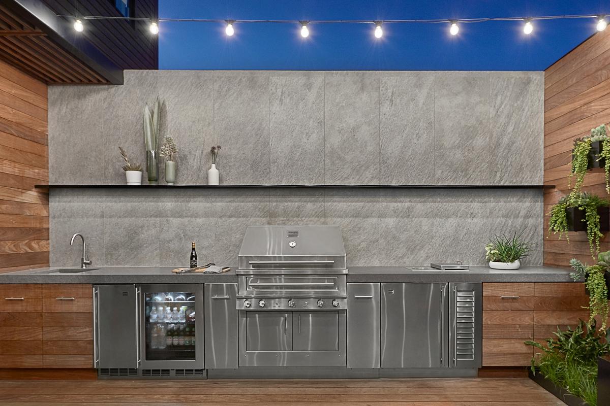 The K750HB Hybrid Fire Grill was selected for its powerful gas grilling and flexibility for large- or small-scale cooking. A built-in Smoker Cabinet was added for its exceptional American BBQ capabilities, a favorite cooking style for this family. The addition of a beverage center, icemaker, sink, and weather-tight Signature Series storage cabinets make the outdoor kitchen completely independent from the indoor kitchen while creating a sleek, cohesive look across the entire space. “The stainless steel cabinetry and appliances really complement the design - which includes a warm palette of ipe wood, black steel and porcelain tile that resembles stone,” Kevin says.