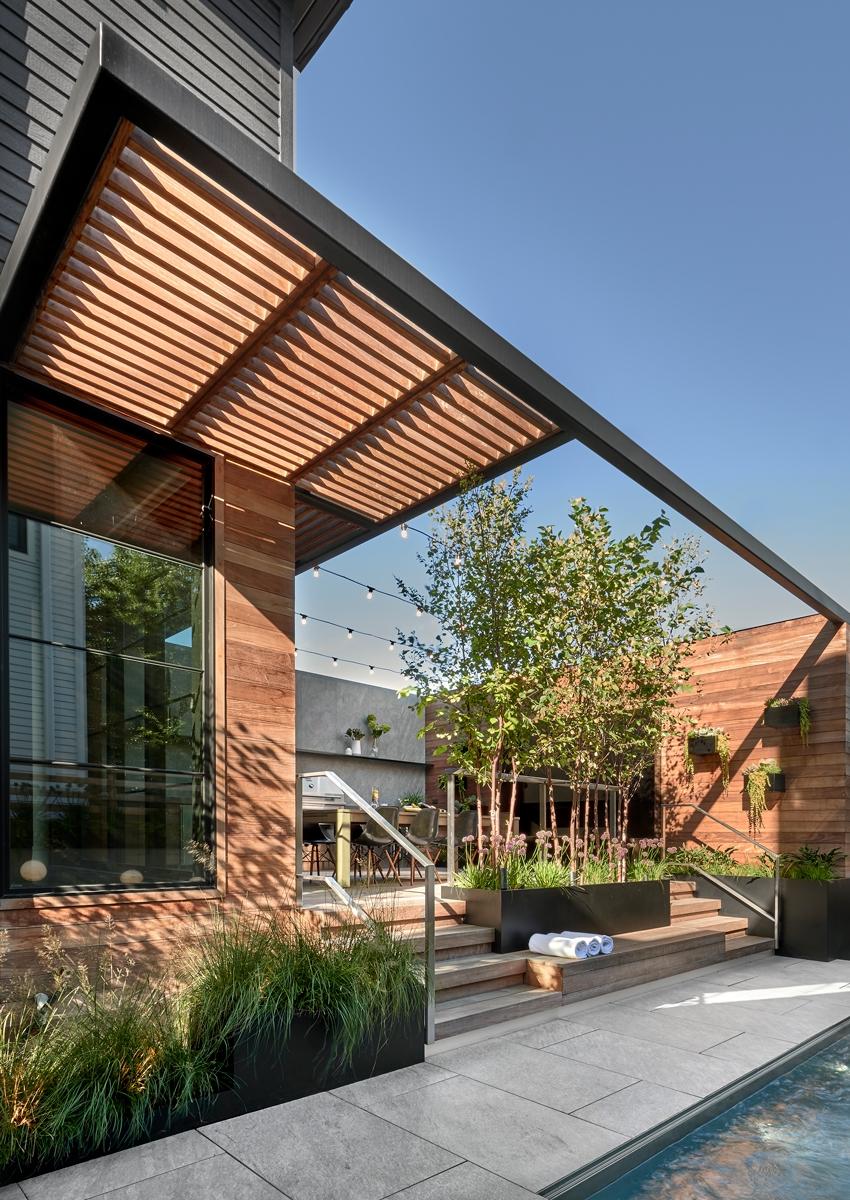 A beautiful city home in the Lakeview neighborhood of Chicago now features an outdoor space inspired by open-air living in California wine country, where the homeowners have roots. dSPACE Studio’s architects, Kevin Toukoumidis and Bob McFadden, worked with their clients to create a backyard that not only works well as a primary home for weeknight dinners and afternoons in the yard but also has a vacation-like feel for Chicago summers and entertaining.