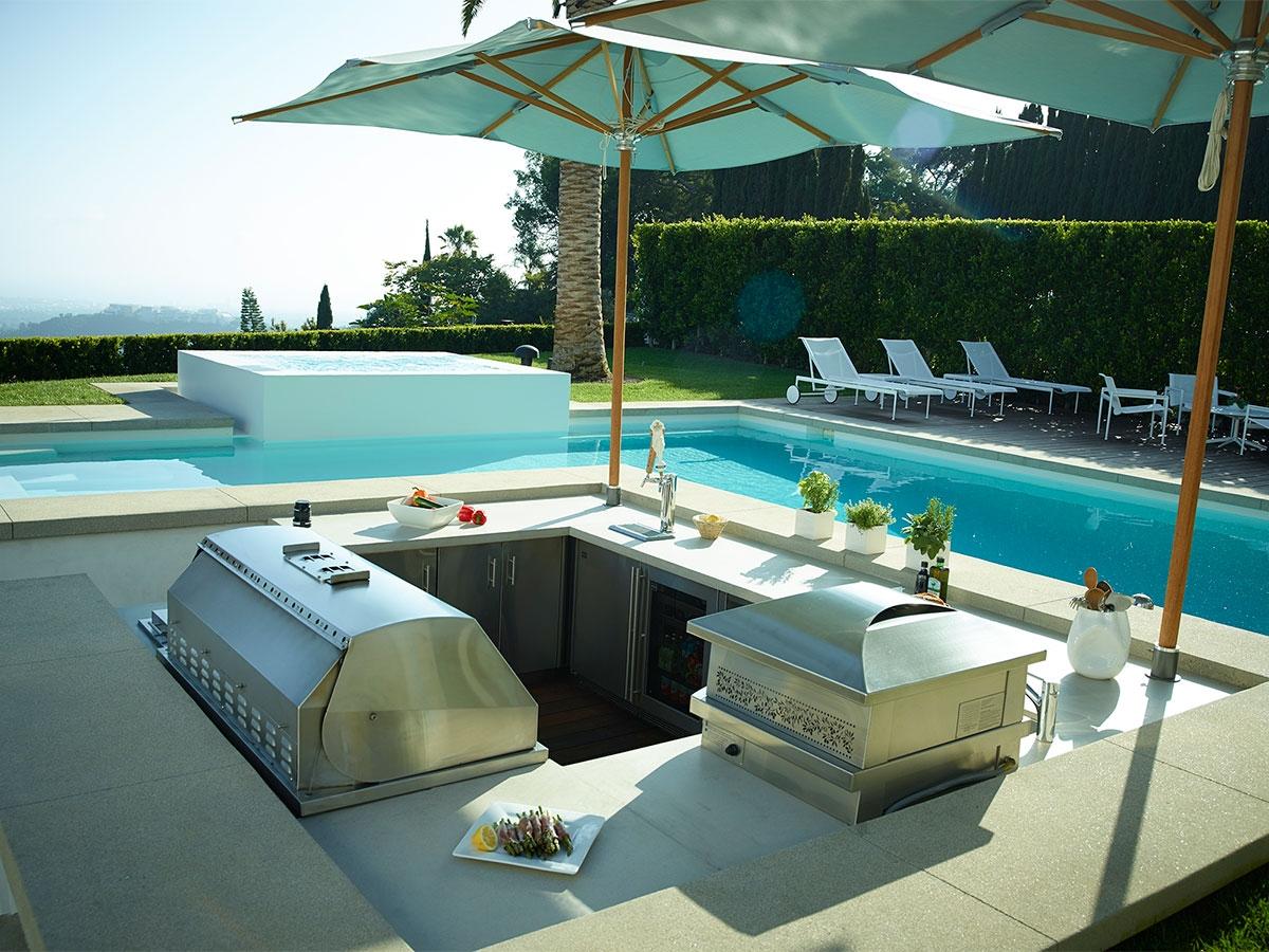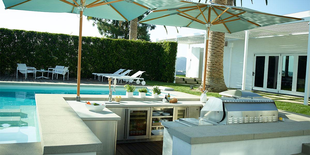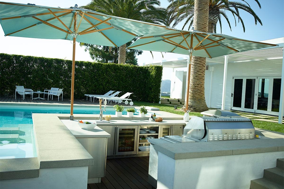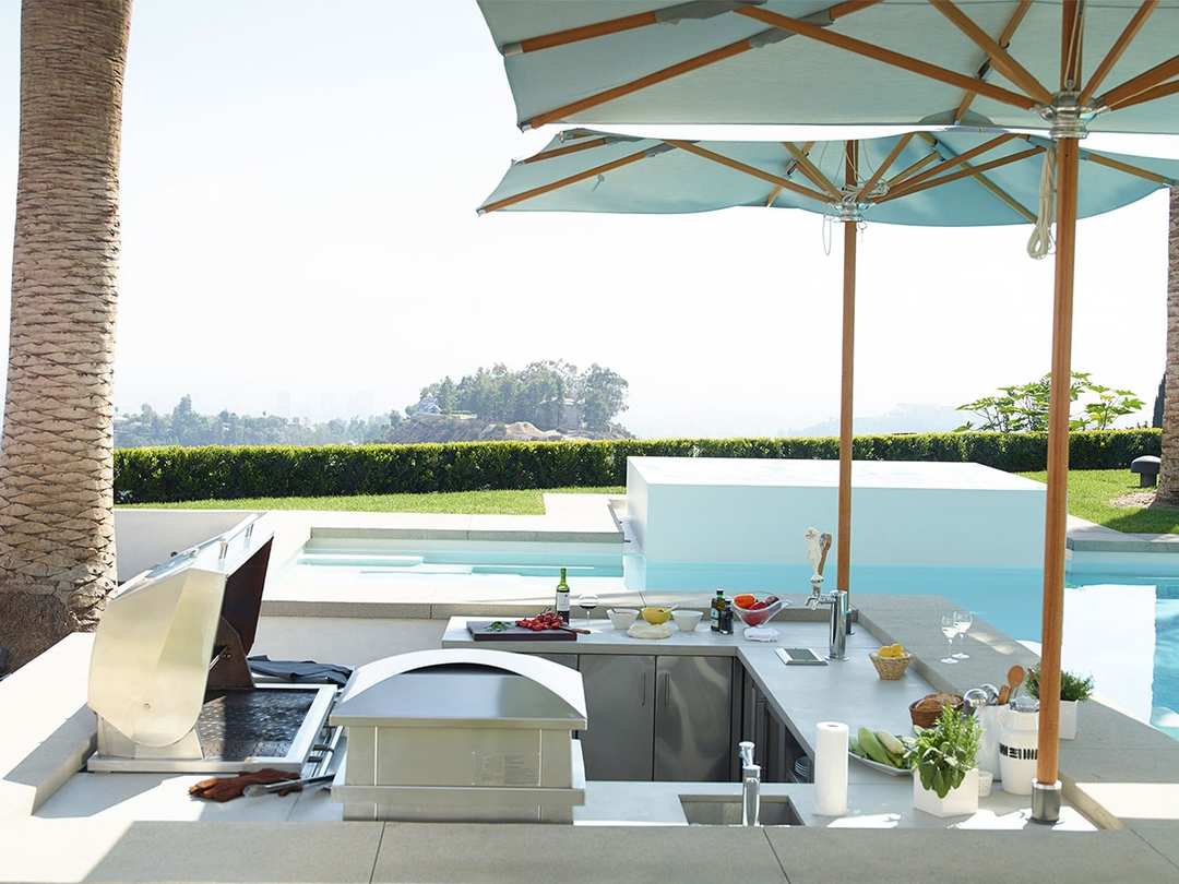 This Kalamazoo Outdoor Gourmet kitchen provides a sleek, modern space for the homeowner to enjoy the beautiful California weather and stunning Los Angeles views. The kitchen is a cooks dream, outfitted with the powerful Kalamazoo Hybrid Fire Grill and Artisan Fire Pizza Oven. Weather-tight stainless steel cabinetry, a beverage center and an outdoor dishwasher make this kitchen completely self-contained – the ultimate convenience, especially when entertaining. The homeowner also had a Kalamazoo keg tapper installed, so he can enjoy draft beer with his guests, in his own outdoor kitchen.