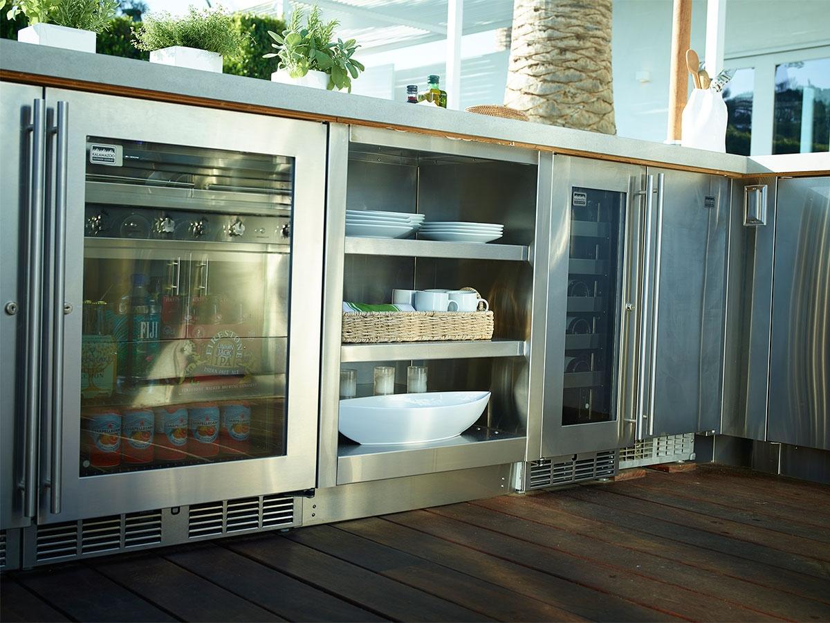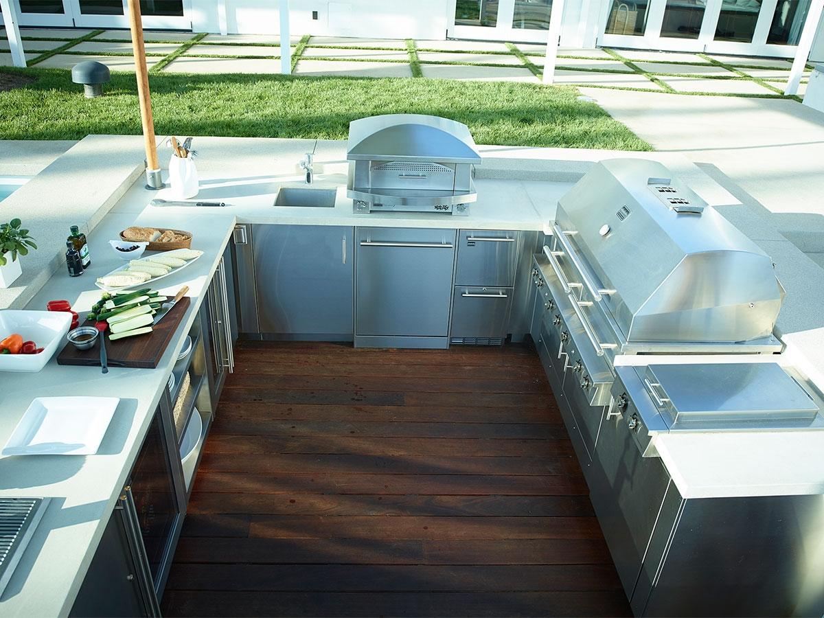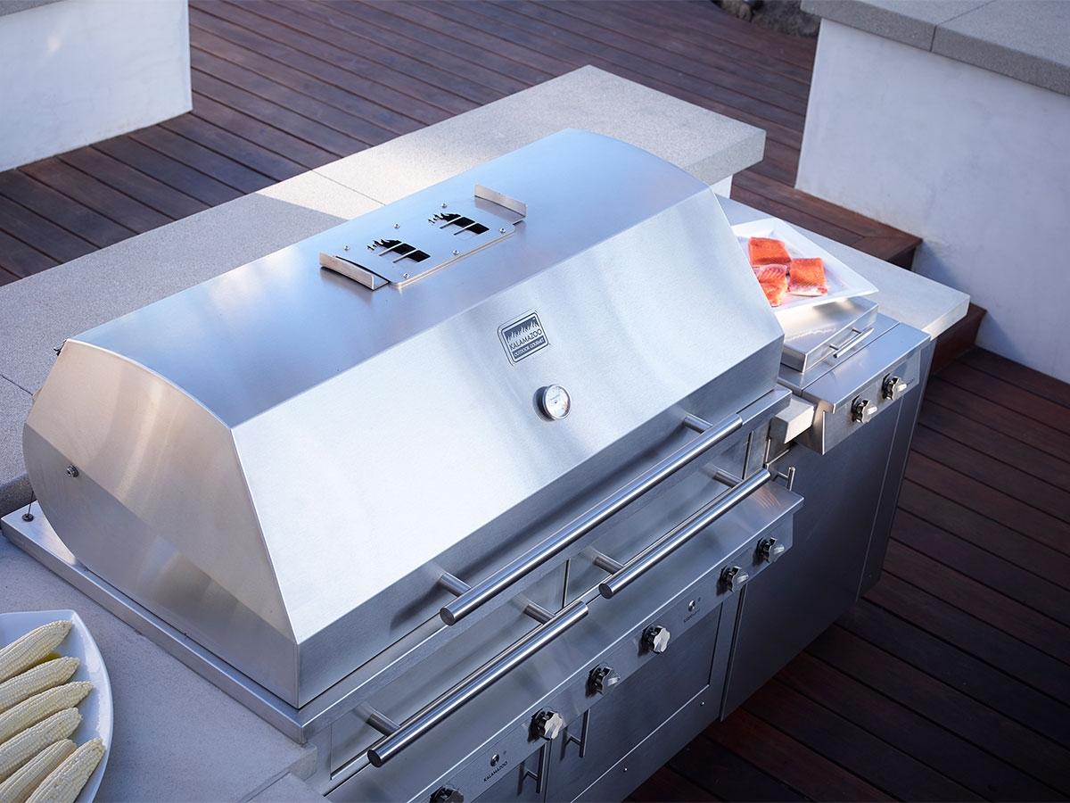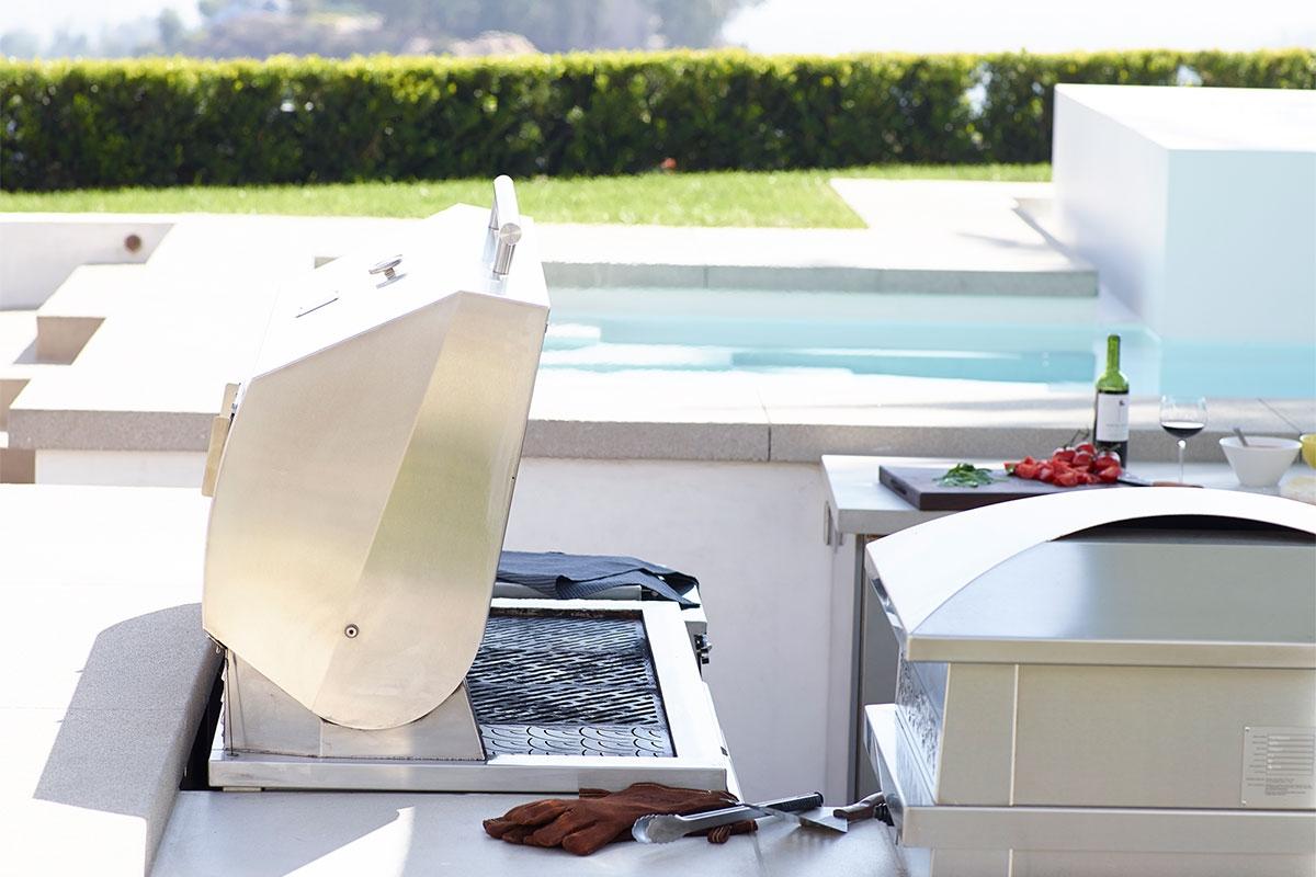 This Kalamazoo Outdoor Gourmet kitchen provides a sleek, modern space for the homeowner to enjoy the beautiful California weather and stunning Los Angeles views. The kitchen is a cooks dream, outfitted with the powerful Kalamazoo Hybrid Fire Grill and Artisan Fire Pizza Oven. Weather-tight stainless steel cabinetry, a beverage center and an outdoor dishwasher make this kitchen completely self-contained – the ultimate convenience, especially when entertaining. The homeowner also had a Kalamazoo keg tapper installed, so he can enjoy draft beer with his guests, in his own outdoor kitchen.