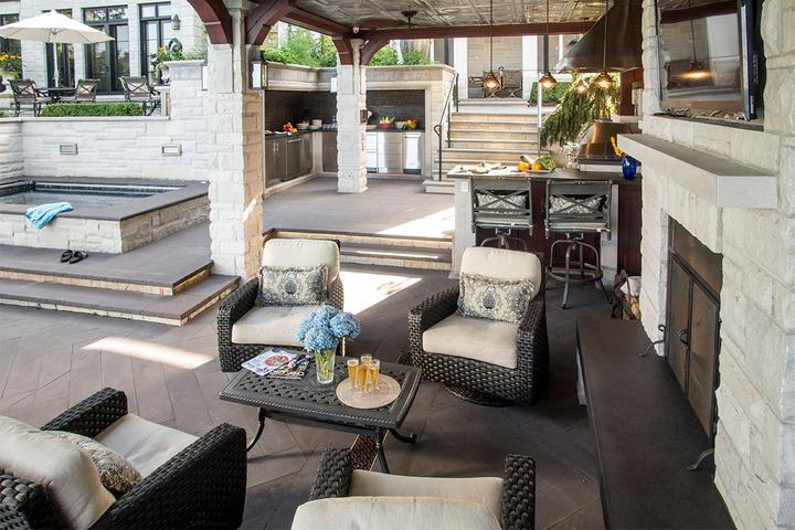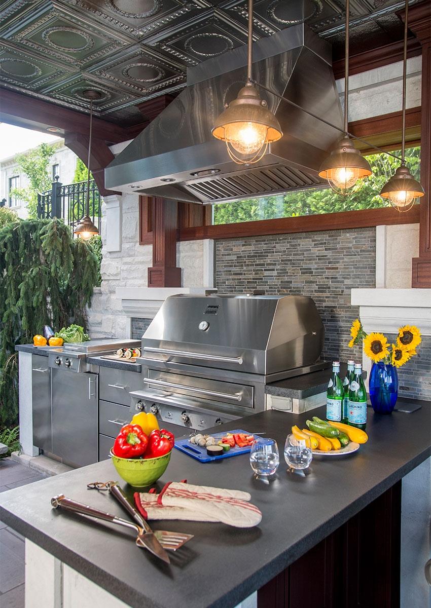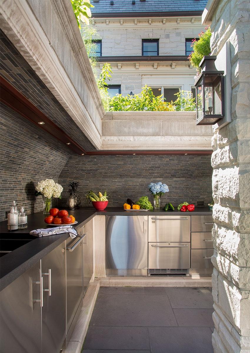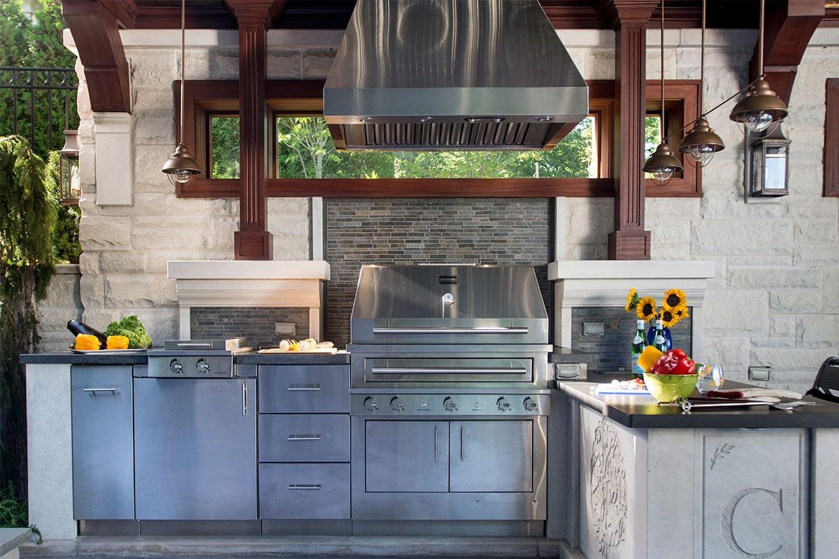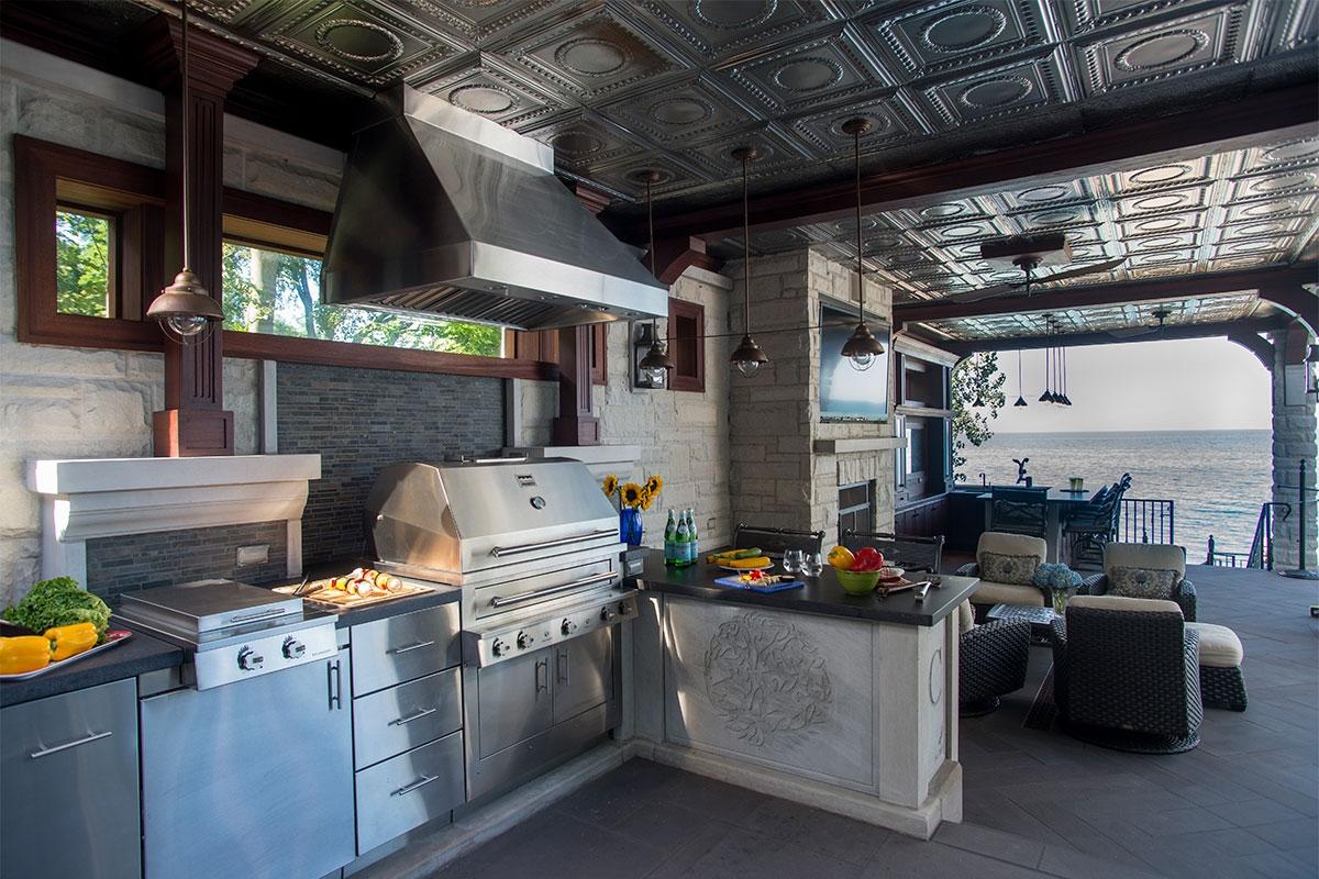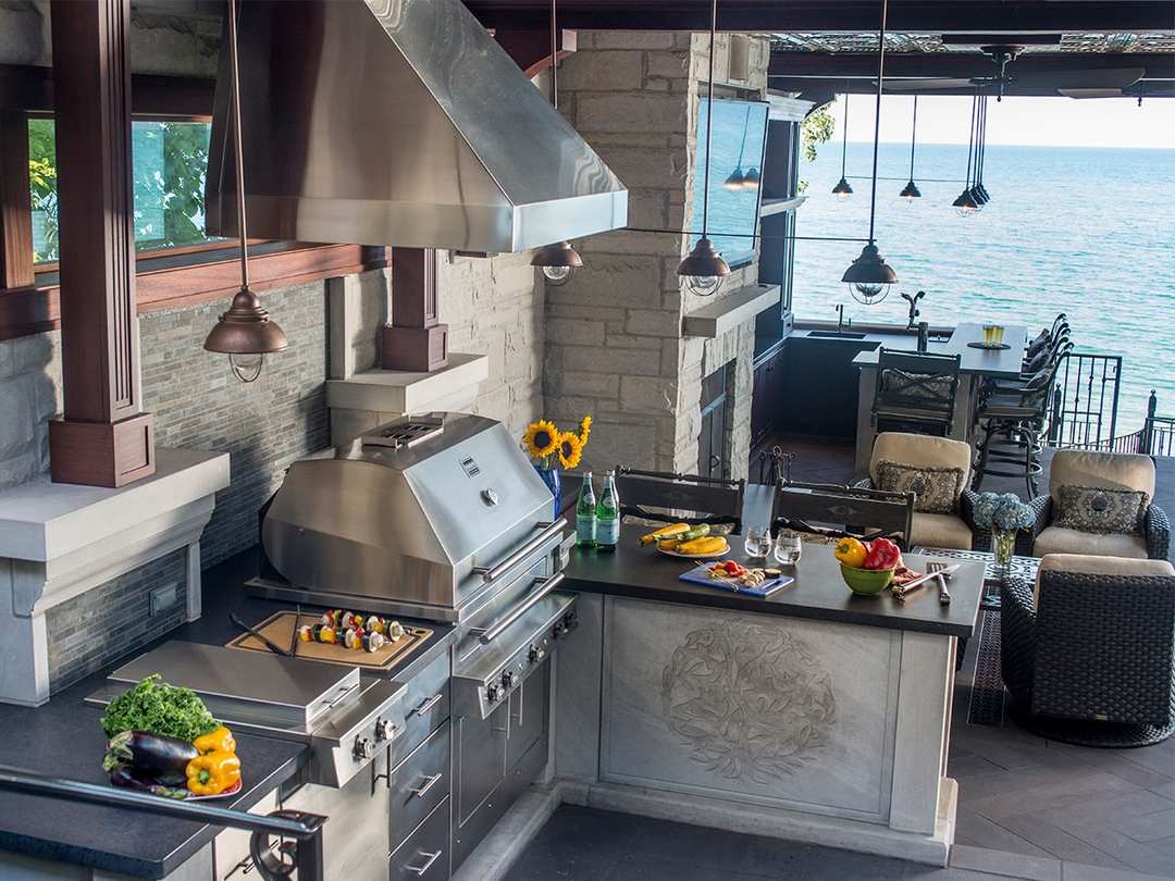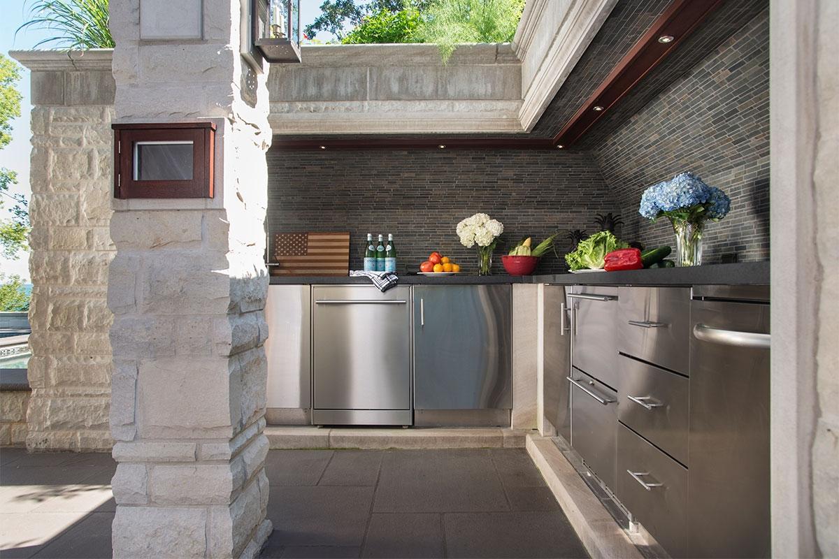 Situated on Lake Michigan in Chicago's prestigious North Shore, this large outdoor kitchen was designed for entertaining friends and family. The kitchen is comprised of three separate areas. The first is an alcove that houses ample outdoor refrigeration and freezers, and an under mounted double sink. The Hybrid Fire Grill is at the heart of the kitchen and is flanked by a double cooktop cabinet and several different forms of weather tight cabinetry for storage. Powerful ventilation is mounted above the grill to capture any smoke or grease and prevent it from bothering guests. The third part of the kitchen is the bar, which includes counter height seating, beverage and wine coolers, and a keg tapper so that the homeowners can enjoy their favorite beers on tap in their own backyard.