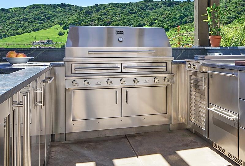 The U-shaped design of the outdoor kitchen features an abundance of Kalamazoo’s weather-tight Signature Series cabinetry. Paul and Stephanie keep these cabinets fully stocked year-round without worrying about water and debris getting inside. The space features a pull-out waste and recycling unit, dish and utensil storage, refrigerated drawers, an outdoor beverage center, and sink base cabinets. The range of cabinetry and their proximity to the cooking zone creates efficient workflows for both the chef and guests. Ample refrigeration and freezer storage was incorporated into the kitchen so the homeowners can keep everything they need on hand to prep, cook, and eat meals in this gorgeous outdoor setting.