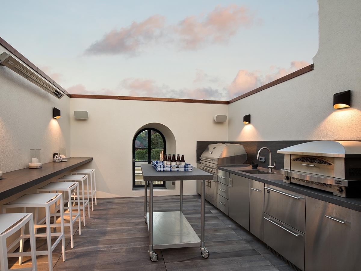The rooftop kitchen is fully equipped to function independently of the indoor kitchen. The Kalamazoo Hybrid Fire Built-in Grillserves as the focal point. This incredibly versatile grill can cook with gas, wood and charcoal, making it the powerhouse of the outdoor kitchen.