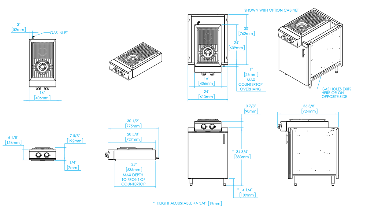 The power wok cooktop features one 26,000 BTU tri-ring burner and one 19,000 BTU brass burner. Install into masonry or one of our 24-inch modular cooktop cabinets.