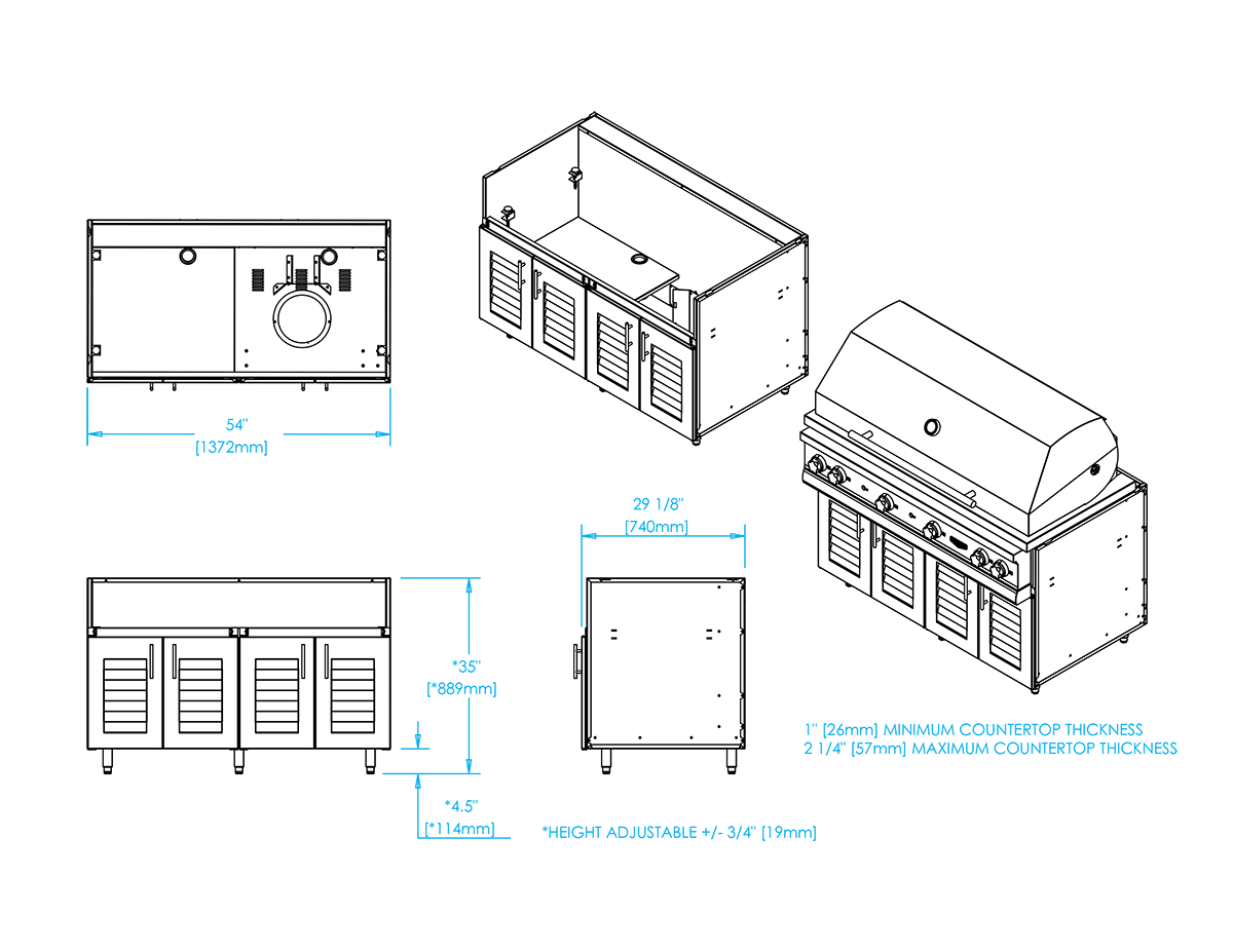 - Adjustable grill supports inside cabinet accommodate countertop thicknesses from 1 inch (26 mm) to 2.25 inches (57 mm)