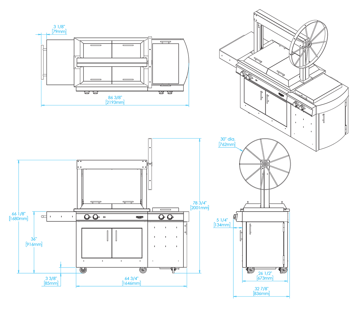 Harness the rugged power and incomparable flavor of wood fire grilling. The Gaucho Grill's gas starter system starts a roaring fire in minutes and food can be raised and lowered above the heat using the 30-inch spoked wheel.